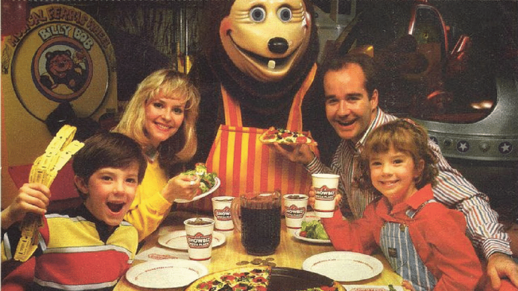 ShowBiz Pizza Place burst onto the scene in 1980, combining pizza, arcade games, and a raucous animatronic band called the Rock-afire Explosion. The chain was founded by Robert L. Brock and was designed to compete with Chuck E. Cheese and quickly became a birthday party favorite for ‘80s kids.